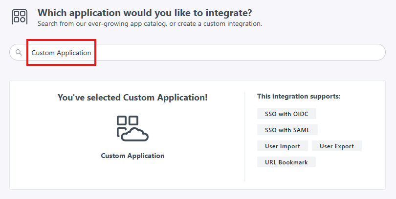 W oknie Create New Application Integration znajdź Custom Application, wybierz ją i kliknij Next.