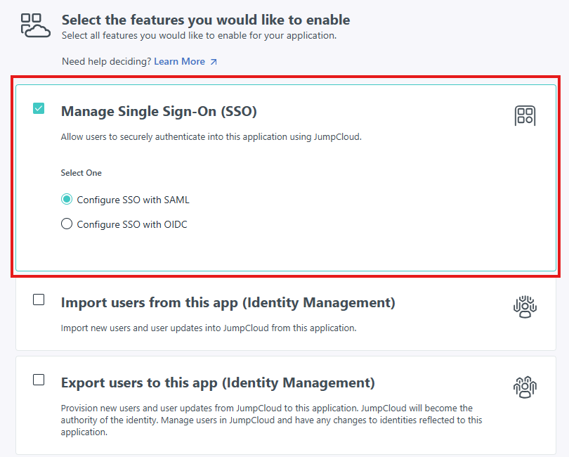 Zazbacz pole Manage Single Sign-On (SSO) i wybierz opcję Configure SSO with SAML, następnie kliknij Next.