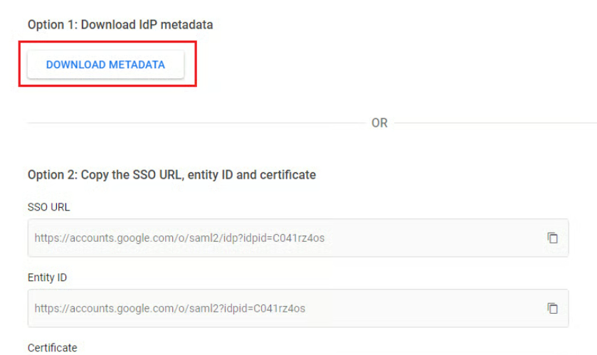 Następnie kliknij przycisk DOWNLOAD METADATA znajdujący się pod "Option 1: Download IdP metadata". Prześlij pobrany plik na swój serwer i zapisz jego adres URL (będzie potrzebny później do konfiguracji Xopero ONE).