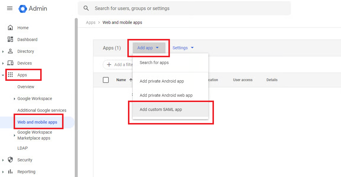 Apps > Web and mobile apps. Kliknij Add app i z menu rozwijanego wybierz Add custom SAML app.