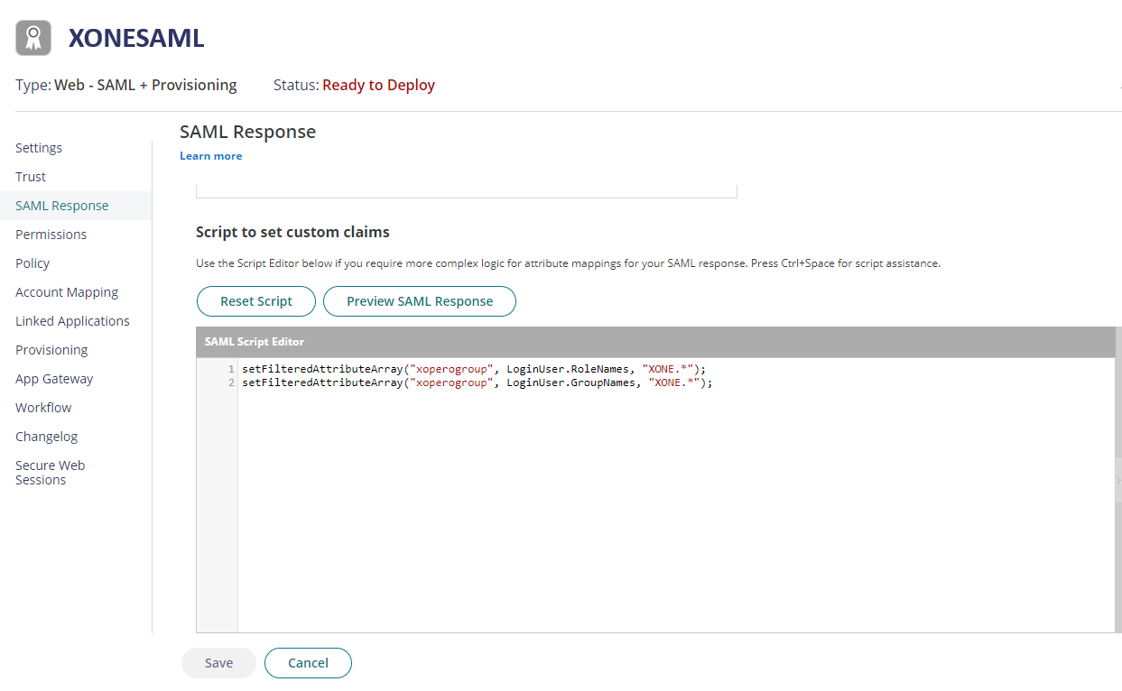 Przejdź do zakładki SAML Response i przewiń do sekcji Script to set custom claims. Wprowadź poniższy skrypt i naciśnij przycisk Save: