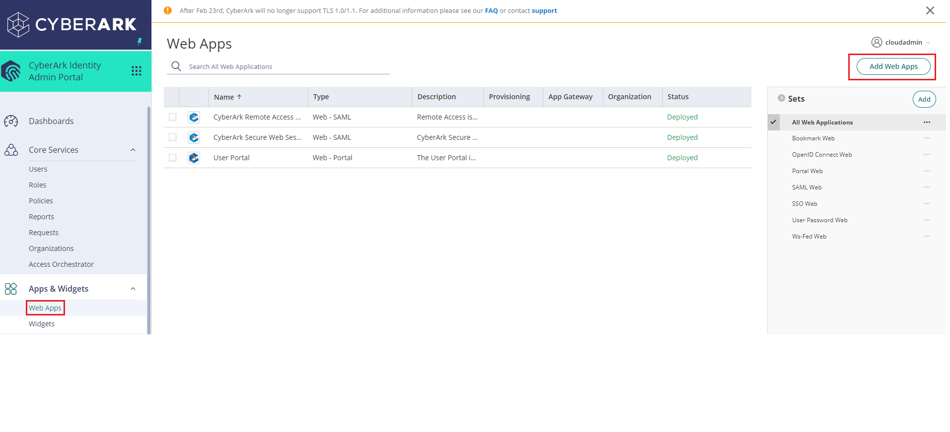 Zaloguj się do konta CyberArk. Rozwiń menu rozwijane Apps & Widgets dropdown i wybierz Web Apps.