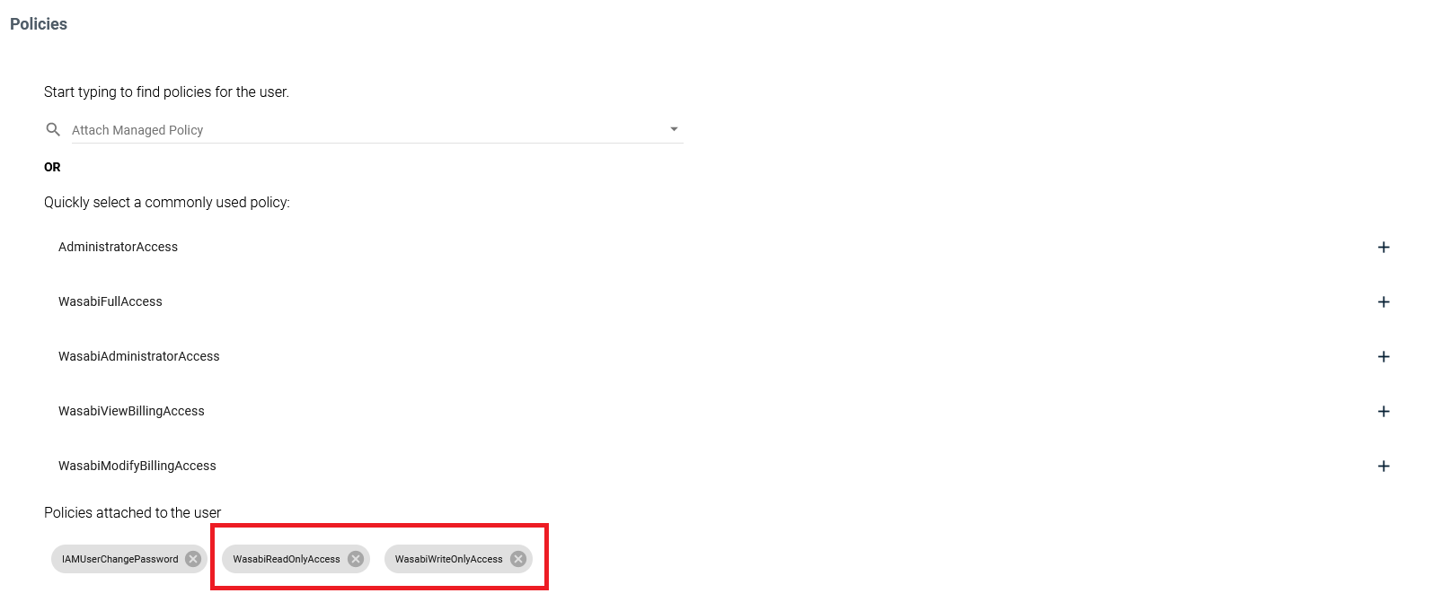 Aby utworzyć nowe konto użytkownika lub edytować istniejące, przejdź do zakładkiUsers. W sekcji Policies, wybierz WasabiReadOnlyAccess oraz WasabiWriteOnlyAccess, zależnie od potrzeby.