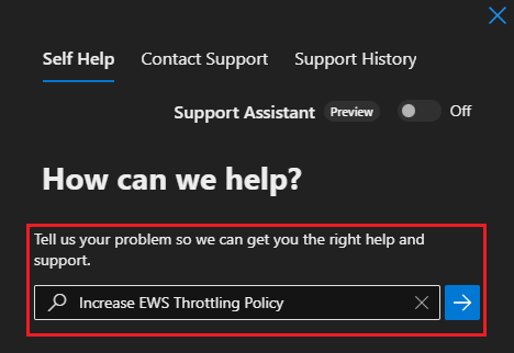 W polu wyszukiwania wprowadź EWS i wybierz Increase EWS Throttling Policy z listy.