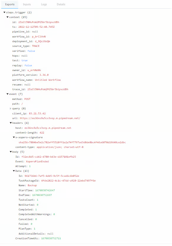 Przykład pełnego żądania POST wysłanego przez system Xopero ONE aby przetestować webhooka używając platformy Pipedream