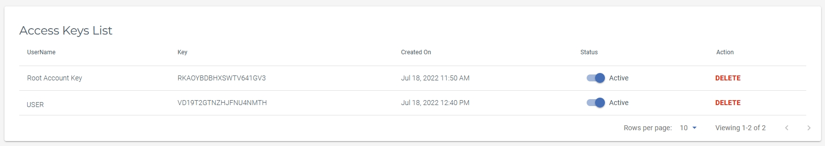 Access keys are generated for each Wasabi user account. You can view the list of access keys by logging in to your Wasabi account and navigating to the Access Keys tab.