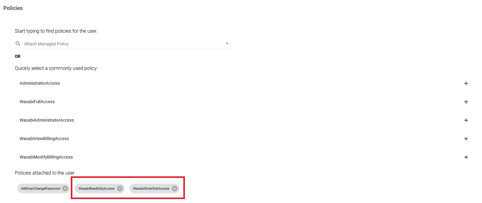 To create a new user account or edit an existing one, go to the Users tab. In the Policies section, select WasabiReadOnlyAccess and WasabiWriteOnlyAccess, according to your needs.