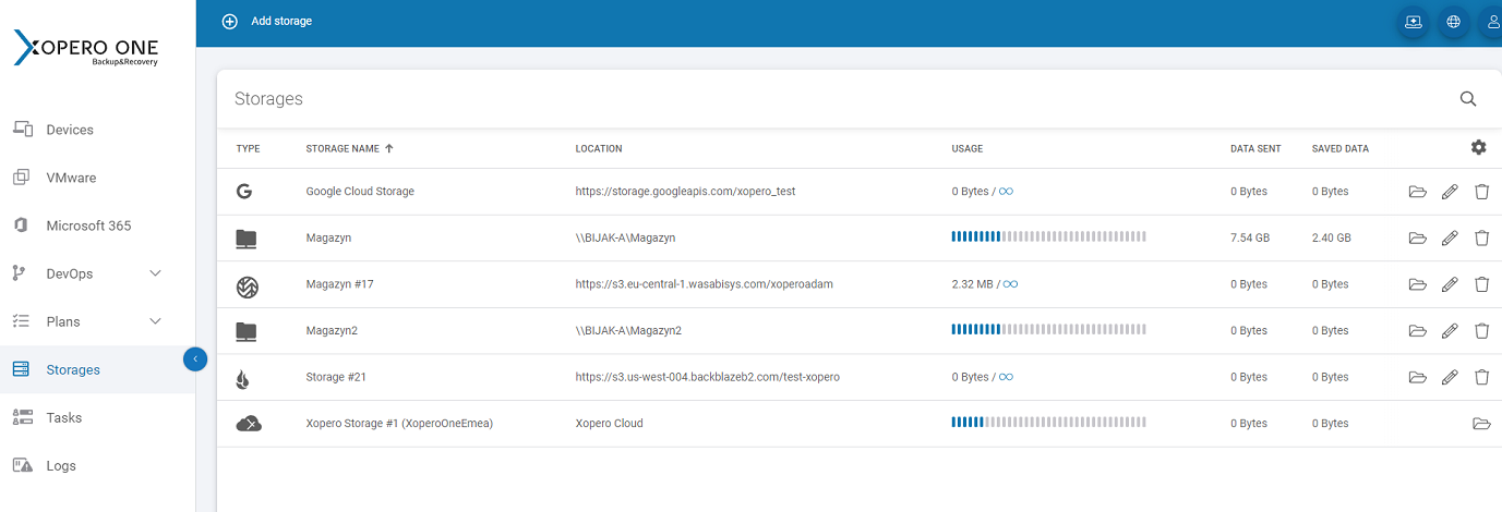 There are nine types of storage that an administrator can create and use within Xopero ONE system. Storage management is available in the Storages tab in Xopero ONE Management Service (XMS) admin panel.
