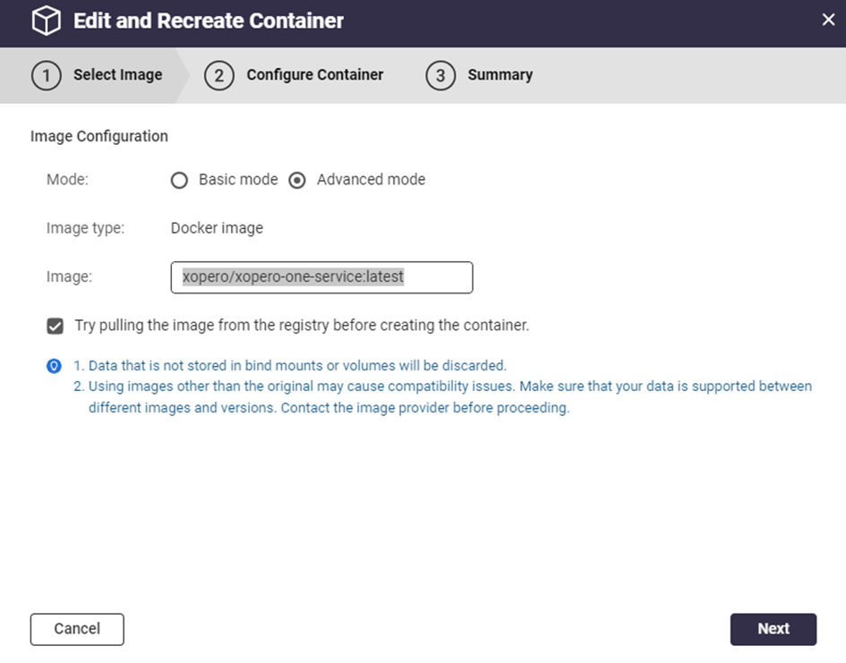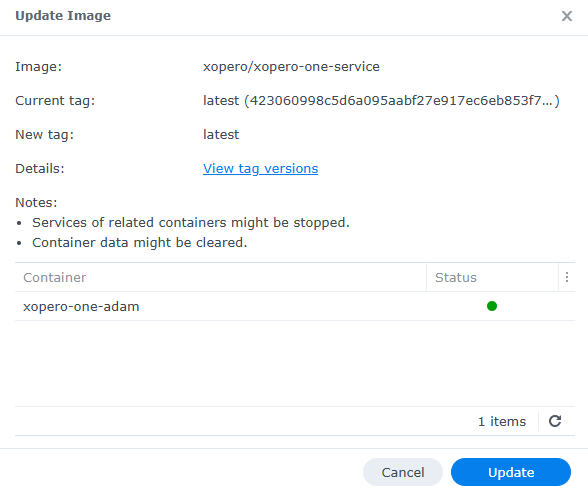 Container Station will download the latest image and create a new container using the previous container’s settings and data. This updates the Xopero ONE Management Service container to the latest version while preserving all existing settings and data.
